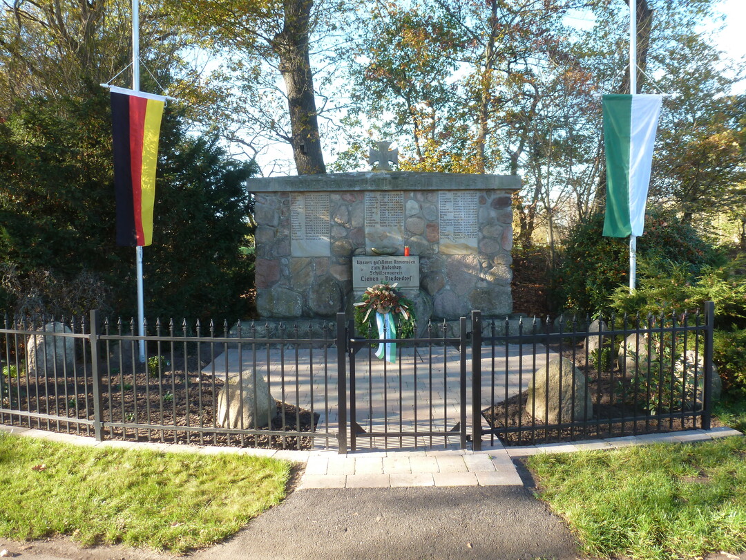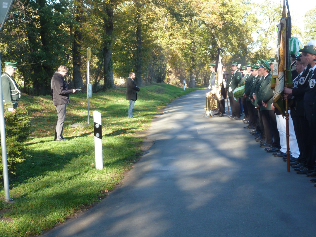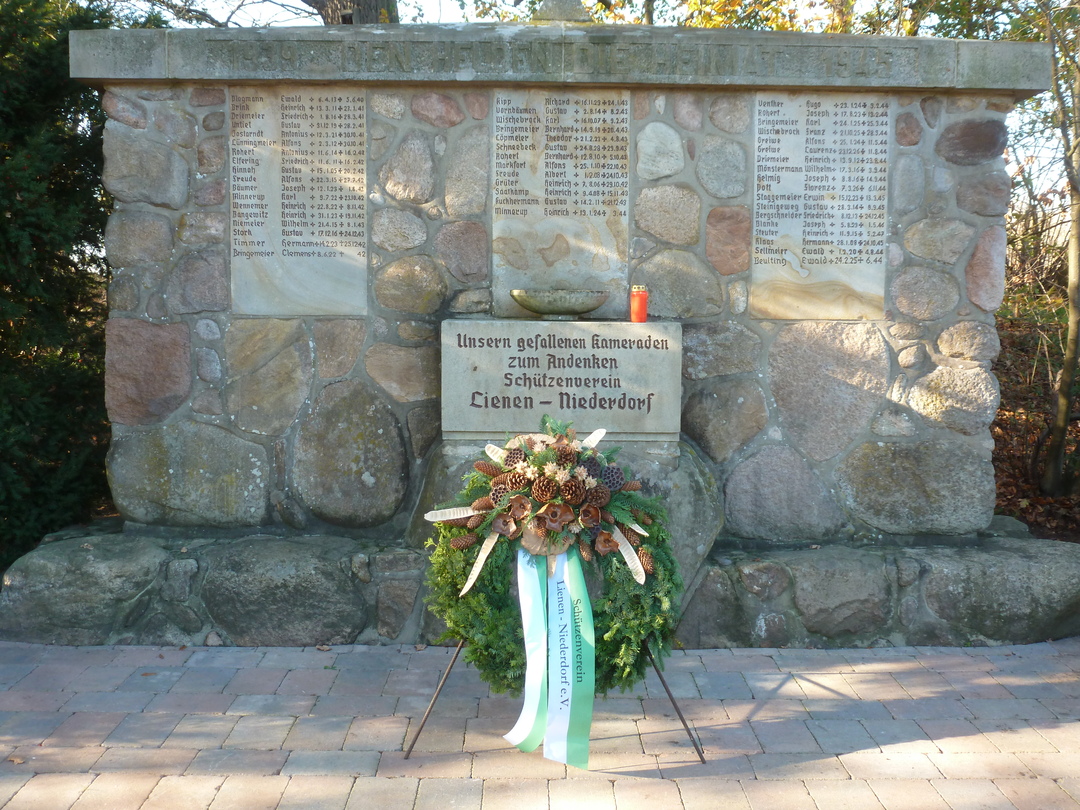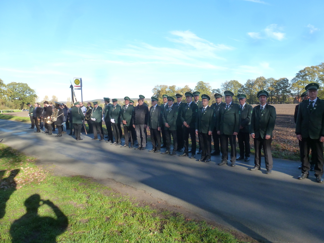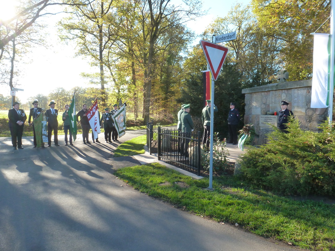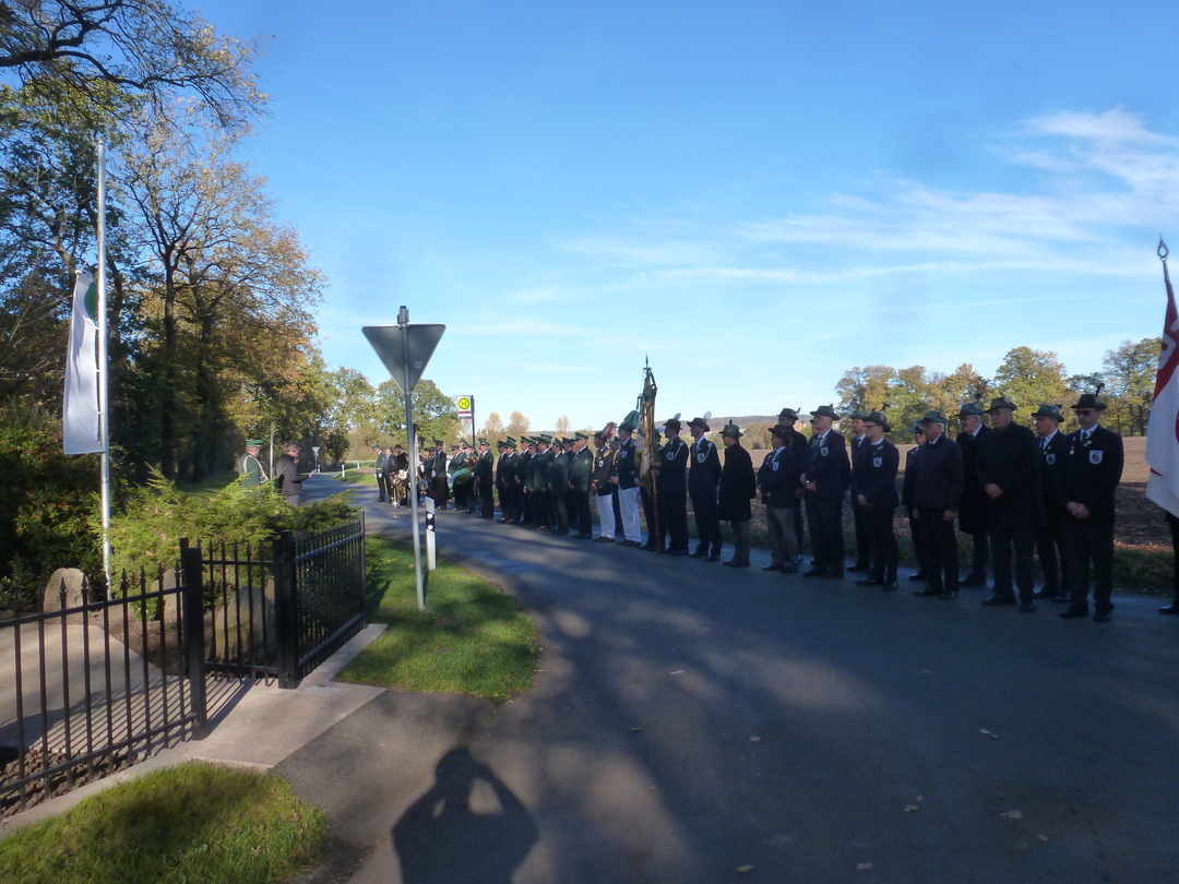 Die Kranzniederlegung an unserem Ehrenmal erfolgte bei herrlichem Wetter und guter Beteiligung. 30 Schützenbrüder waren der Einladung gefolgt. Auch der Bruderverein war gut vertreten.